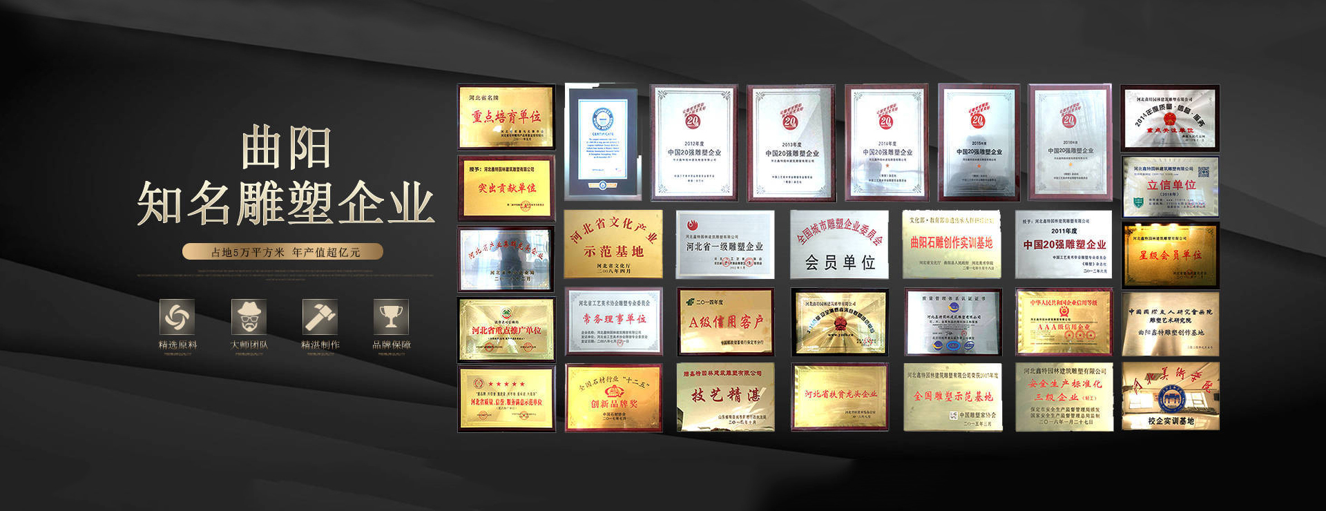 同時,公司也是行業內的佼佼者,連續七年榮獲“中國20強雕塑企業”,并被命名為“全國雕塑示范基地”。2017年,曲陽縣河北鑫特園林雕塑公司還被文化部、教育部、人社部命名為“中國非遺石雕傳承人群研培實訓基地”。